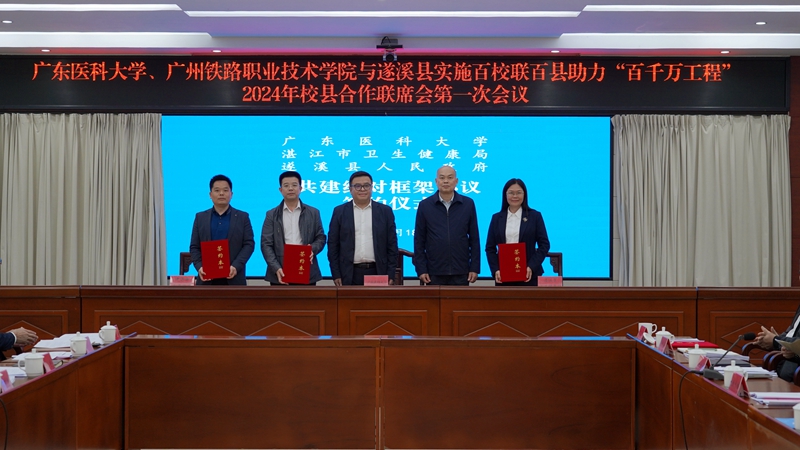 湛江市卫健局党组成员、副局长甘少平,遂溪县领导刘剑、沈东宇、喻锦扬、庞宇、朱帝池、蒲火元,县委办、县府办等单位主要领导以及县“百千万工程”指挥部办公室负责同志,广州铁路职业技术学院党委书记张竹筠,校领导卢景辉、曾志嵘,党委常委、组织统战部部长谭平及相关职能部门、学院、附属医院负责人参加会议。