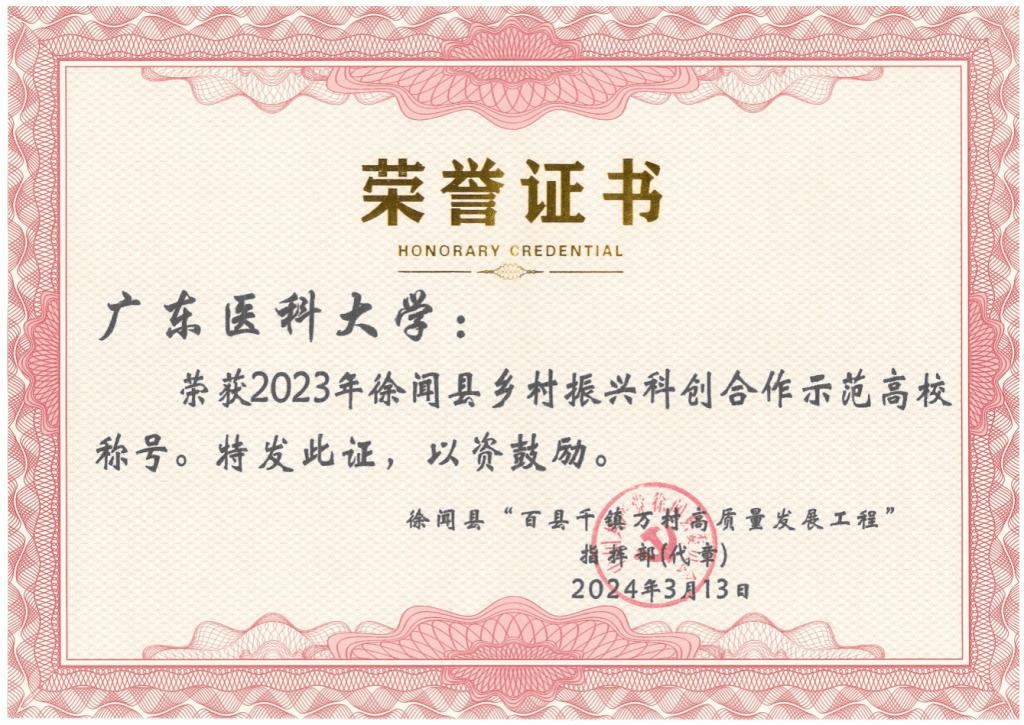 3月18日上午,徐闻县委、县政府在县会议中心举行“百千万工程”“镇在进行、村在行动”大比武2023年总结表彰暨2024年工作部署大会。会上,评选出2023年为徐闻县百千万工程、乡村振兴工作作出突出贡献的单位与个人进行总结表彰,学校获评“2023年徐闻县乡村振兴科创合作示范高校”称号。会议由徐闻县县长黄来兴主持,县党委书记罗红霞出席讲话并颁奖。