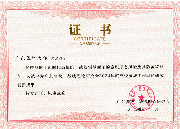 省委统战部二级巡视员林奕丹宣读广东省高校统战工作理论研究成果表彰的决定,此次评选工作共收到38所高校386篇理论研究成果,评选出优秀成果50篇。我校人文与管理学院揭志辉撰写的《新时代高校统一战线领域面临的意识形态风险及其防范策略》一文被评为2024年度高校统战工作理论研究创新成果。