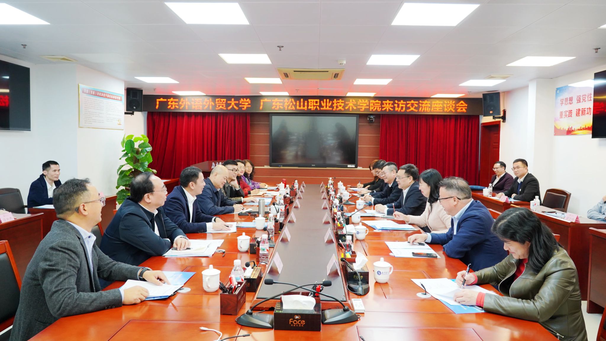 12月14日下午,广东外语外贸大学党委书记石佑启一行与广东松山职业技术学院党委书记方迎生一行带队来校交流,座谈会在湛江校区综合楼四楼第一会议室召开。座谈会由学校党委书记、校长卢景辉教授主持。