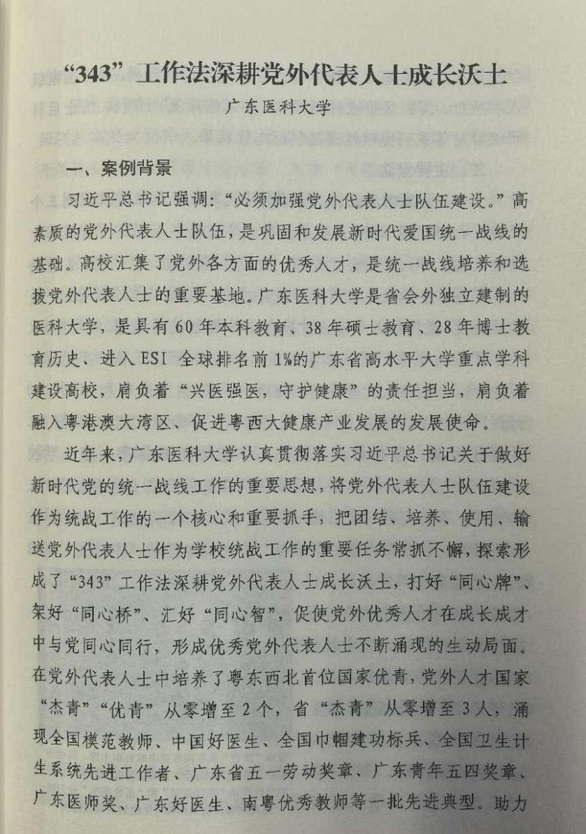 近日,中共广东省委教育工作委员会印发《统战工作优秀案例》,学校组织统战部报送案例《“343”工作法深耕党外代表人士成长沃土》入选。