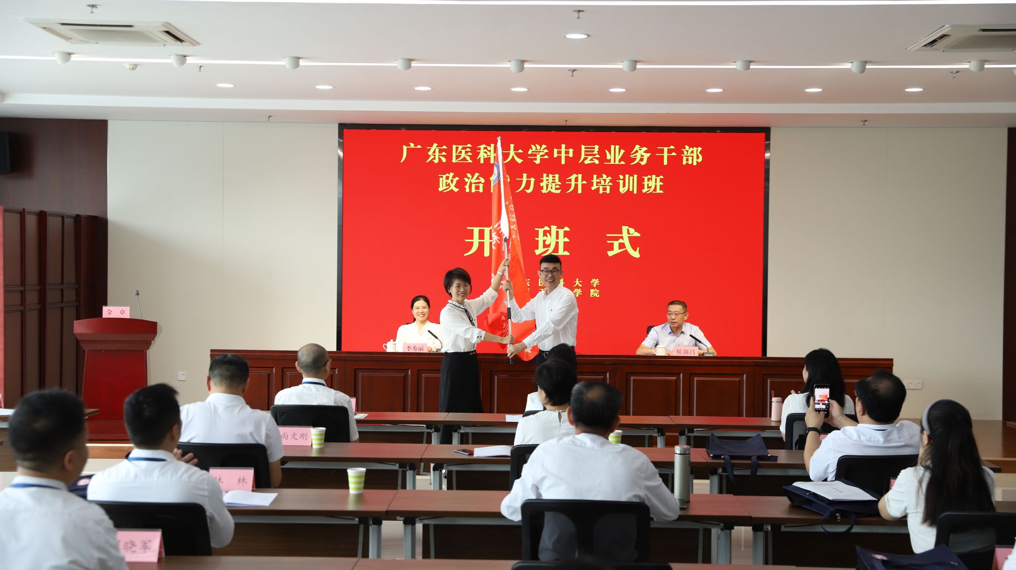 7月22日上午,培训班在沂蒙干部学院举行开班仪式。沂蒙干部学院副院长侯锦昌致欢迎辞,学校组织统战部副部长李秀丽宣读临时党支部成立文件,黄达海为培训班授班旗,马克思主义学院院长金卓作为学员代表发言。
