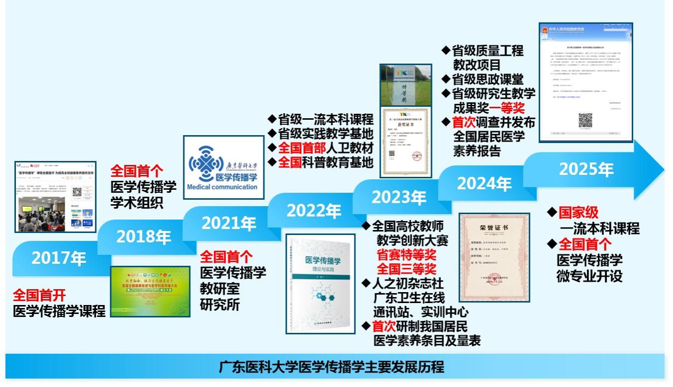 医学传播学是由我校2017年首创的新医科、新文科交叉课程。团队在国内外首次提出医学传播学和居民医学素养概念及相关理论,按学科化推进医学传播学建设;建设微专业;注重新医科对“健康与社会领域”职业素质的培养,助力培养能“胜任诊疗决策者、做好健康守护人、当好‘医声’传播者”的卓越医师;推进医学传播学研究,研制我国居民医学素养63条及量表;2024年首次调查并发布;促进医防融合,主动服务健康中国战略,践行“兴医强医,守护健康”使命。