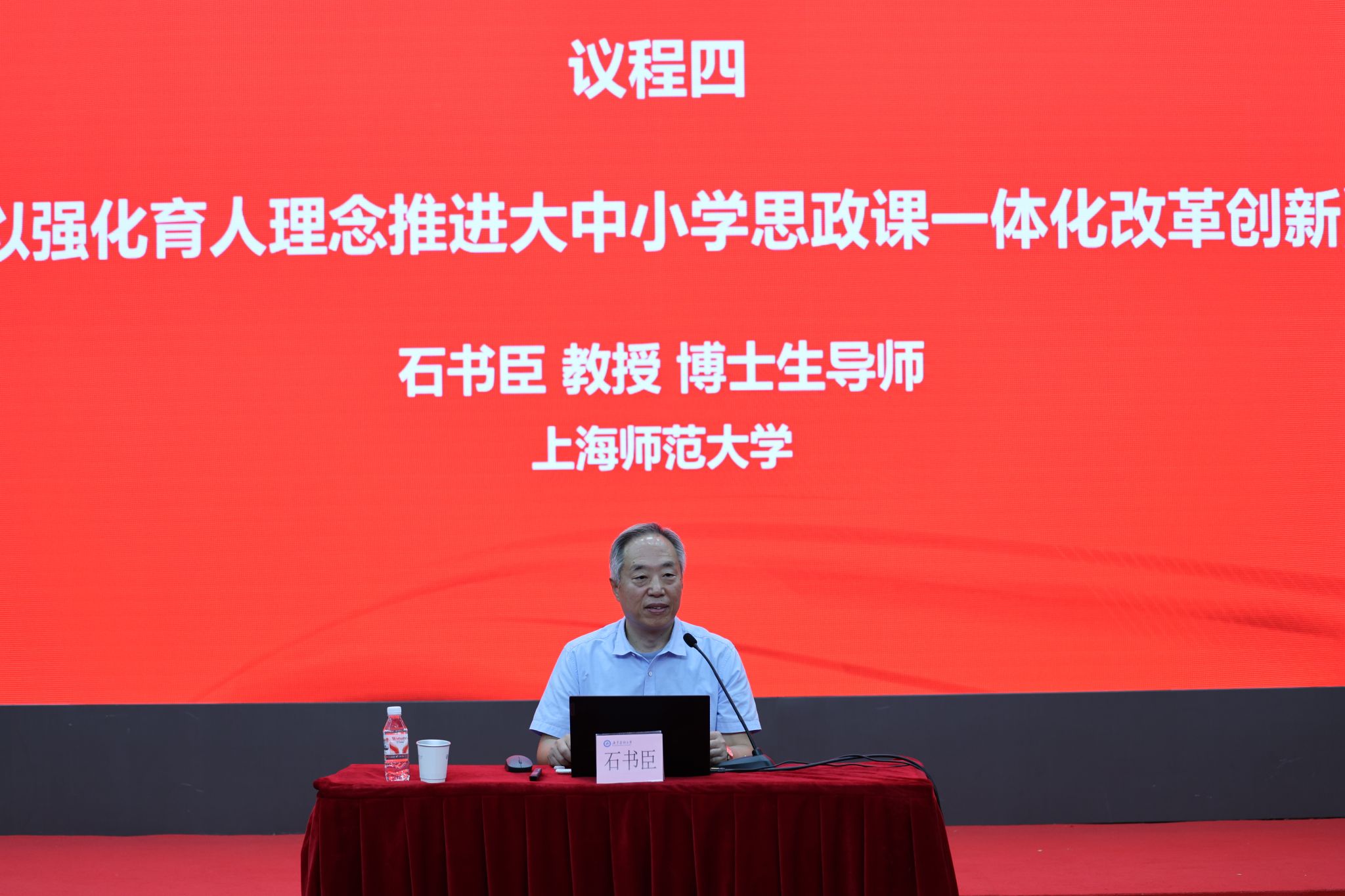 石书臣教授带来专题讲座《以强化育人理念推进大中小学思政课一体化改革创新》,他强调,一体化是办好思政课的必要途径,必须以强化育人理念深入推进大中小学思政课一体化建设,坚持育人本质,推动大中小学思政课一体化建设内涵式发展;明确育人目标,坚定大中小学思政课一体化建设培养人导向;增强育人功能,突出大中小学思政课一体化建设育人性定位;遵循育人规律,提高大中小学思政课一体化建设科学化水平。讲座为“大中小学思政课一体化创新示范联合体”建设提供了重要的理论指引。
