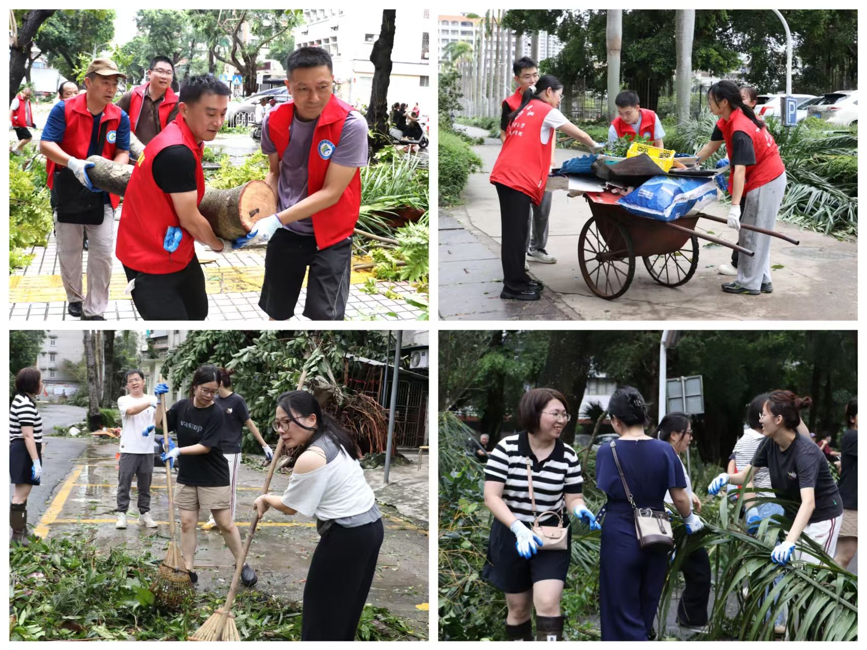 机关党委第一时间组织,校内外都派员积极参与。6名机关党委突击队员以军转干部的过硬作风参与地方政府灾后秩序恢复,在文明东路北侧锯断约20棵倒伏树木、清理500多米路段,疏通水道,保障小区与非机动车道正常通行,获得群众高度认可。陈海容老师看到志愿者忙碌的身影时动容道:“师生们的热情像一束束光,让我们面对灾难不再孤单。”