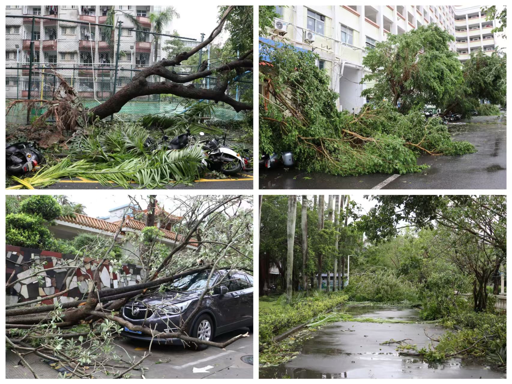海洋与热带医学学院师生或合力搬开倒伏树干,或细致清理路面断枝杂物,并与学校设备处、后勤处相关工作人员一同检查实验楼受损情况,彻底消除安全隐患。