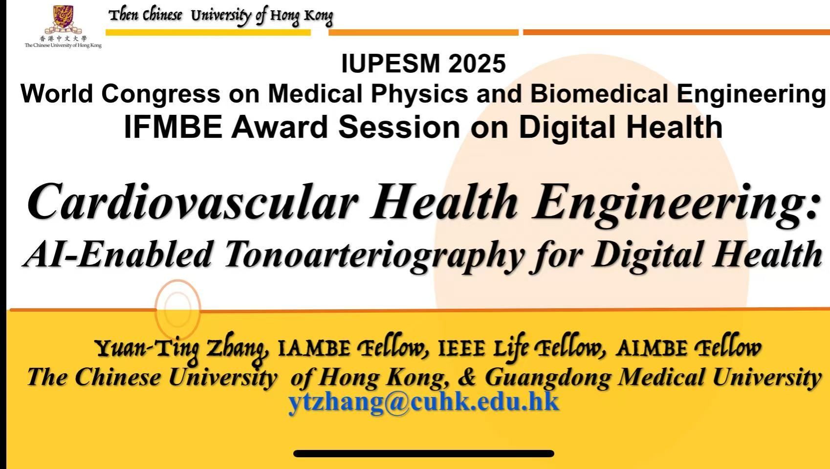 2025年9月30日,2025年世界医学物理与生物医学工程大会(IUPESM WC)在澳大利亚盛大召开。会上,我校首席科学家(人工智能与心脑血管工程湾区实验室主任)、香港中文大学研究教授张元亭荣获2025年IFMBE DHD 数字健康“杰出贡献奖”。张元亭教授还是国际医学与生物工程院院士、电气电子工程师学会终身会士(IEEE Life Fellow)、美国医学与生物工程院会士以及亚洲人工智能协会会士,香港工程师协会会士,此次获奖,也让他成为首位斩获该奖项的亚洲学者。