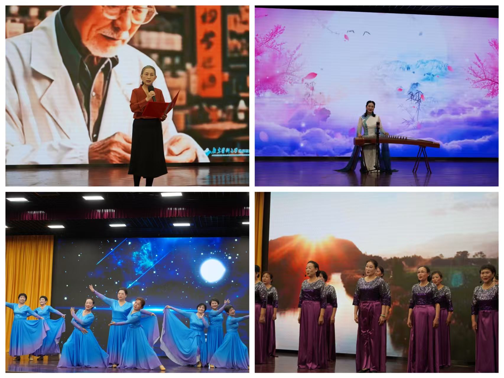 离退休老同志、各附属医院同仁与在校师生用精心编排的节目,献上一场充满温情与敬意的艺术盛宴。开场舞蹈《天之大》以柔美而有力的舞姿表达对母亲、对亲情的深情赞颂;诗朗诵《光的第二程》讲述老同志“退休不褪色、初心永不变”的故事;古筝独奏《女儿情》清澈婉转,尽显传统民乐魅力;民乐表演队带来的民歌串烧节奏明快、气氛热烈,洋溢着喜庆祥和的节日气息;筝鼓合奏《爱我中华》旋律激昂、气势磅礴,表达了热爱祖国、同心向党的真挚情感;女声独唱《最美是你》深情礼赞默默奉献的老同志;旗舞《等你》则以流动的旗韵和光影展现力量与美感的融合。演出节目生动展现了我校离退休群体“老有所学、老有所乐、老有所为”的精神风貌,也传递出全校师生尊老、敬老、爱老、助老的真挚情感。