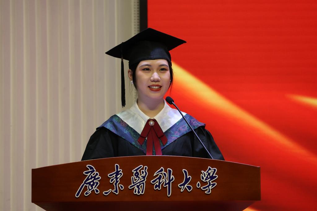 本科生毕业生代表、第二临床医学院赵黎晖表示,五年的医学学习让她从懵懂走向成熟,也让她掌握了不少医学上有标志性意义的温度,比如,37.3℃,这是体温的警戒线,在感染科,温度是线索,需要医生抽丝剥茧找出真实病因;80℃,热消融时针尖温度,以高温杀灭肿瘤细胞;45℃,是中医艾灸的温度……在广东医,她还感受着特别的温度,那是“做了一辈子好事”的内科学教授何建猷老师,在每一次给病人听诊时,她用手焐热听诊器的温度,还有“学院+书院+医院”三院育人带给我们的学业、文化和技能共同提升的三重温度。新的征途上,她的医学梦想仍在延续,我愿做医学温度的传递者,铭记母校的教诲,传承“立志立德、求真求精”的校训精神,将医学生誓词记在心间,有爱心,懂人情,明事理,做到“有时去治愈,常常去帮助,总是去安慰”,深刻体会性命相托的凝重,以更加坚定的信念、更加扎实的技能、更加高尚的医德去服务社会、造福人类。