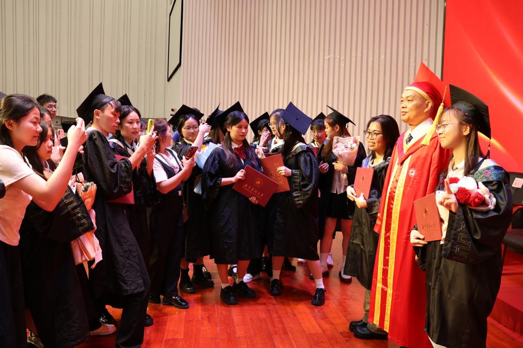 明明已经站了一个上午,明明马上要赶车去湛江校区参加第二天的学位授予仪式,结束时卢景辉仍然舍不得离开,配合着毕业生们合影留念,他会询问毕业生们看向哪一个镜头,同学们镜头在哪里卢景辉就微笑面向哪里。