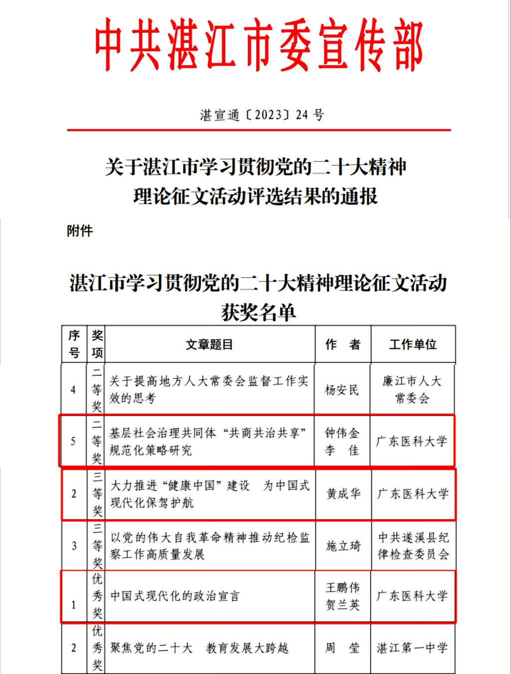 近日,中共湛江市委宣传部公布了《关于湛江市学习贯彻党的二十大精神理论征文活动评选结果的通报》的结果,我校教师荣获佳绩。其中,钟伟金、李佳所作的《基层社会治理共同体“共商共治共享”规范化策略研究》获得二等奖,黄成华所作的《大力推进“健康中国”建设 为中国式现代化保驾护航》获得三等奖,王鹏伟、贺兰英所作的《中国式现代化的政治宣言》获得优秀奖。